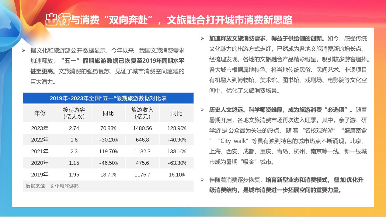 在出行方面,感受傳統(tǒng)文化魅力的出游方式走紅,已然成為各地文旅消費新的增長點。隨著暑期開啟,各地文旅消費市場再次進入旺季。其中,親子游、研學游是公眾最為關注的熱點。伴隨著消費逐步恢復,培育新型業(yè)態(tài)和消費模式,疊加優(yōu)化升級消費結構,是城市消費進一步拓展空間的重要力量。