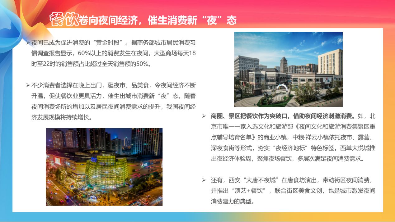 在餐飲消費方面,隨著夜間消費場所的增加以及居民夜間消費需求的提升,我國夜間經濟發(fā)展規(guī)模將持續(xù)增長。例如,北京市唯一一家入選文化和旅游部《夜間文化和旅游消費集聚區(qū)重點輔導培育名單》的商業(yè)小鎮(zhèn),中糧·祥云小鎮(zhèn)依托夜市、露營、深夜食街等形式,構建了“商圈+生活圈+夜經濟”的消費重地,榮獲北京十大商業(yè)品牌、消費季品牌榜“十大文化消費地標”。西安“大唐不夜城”在唐食坊演出,帶動街區(qū)夜間消費,并推出“演藝+餐飲”,聯(lián)合街區(qū)美食文創(chuàng),也是城市激發(fā)夜間消費潛力的典型?!秷蟾妗氛J為,隨著夜間消費場所的增加以及居民夜間消費需求的提升,我國夜間經濟發(fā)展規(guī)模將持續(xù)增長。