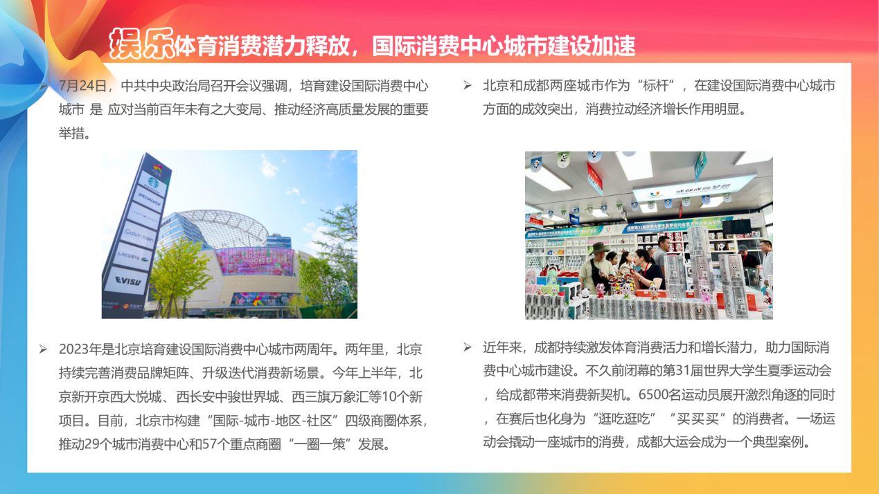 在娛樂體育消費方面,北京、成都兩座城市作為“標桿”,在建設國際消費中心城市方面的成效突出,消費拉動經濟增長作用明顯。以北京為例,2023年是北京培育建設國際消費中心城市兩周年。兩年里,北京持續(xù)完善消費品牌矩陣、升級迭代消費新場景。今年上半年,北京新開京西大悅城、西長安中駿世界城、西三旗萬象匯等10個新項目。目前,北京市構建“國際-城市-地區(qū)-社區(qū)”四級商圈體系,推動29個城市消費中心和57個重點商圈“一圈一策”發(fā)展。