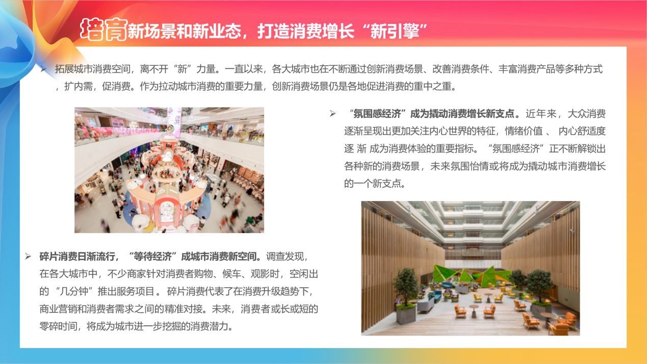 《報告》表示,拓展城市消費空間,離不開“新”力量。一直以來,各大城市也在不斷通過創(chuàng)新消費場景、改善消費條件、豐富消費產品等多種方式,擴內需,促消費。作為拉動城市消費的重要力量,創(chuàng)新消費場景仍是各地促進消費的重中之重。