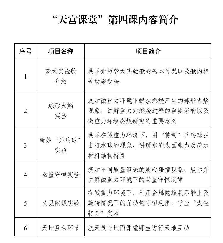 本次太空授課活動(dòng)繼續(xù)采取天地互動(dòng)方式進(jìn)行。3名航天員將在軌展示介紹中國(guó)空間站夢(mèng)天實(shí)驗(yàn)艙工作生活場(chǎng)景,演示球形火焰實(shí)驗(yàn)、奇妙“乒乓球”實(shí)驗(yàn)、動(dòng)量守恒實(shí)驗(yàn)以及又見陀螺實(shí)驗(yàn),并與地面課堂進(jìn)行互動(dòng)交流。