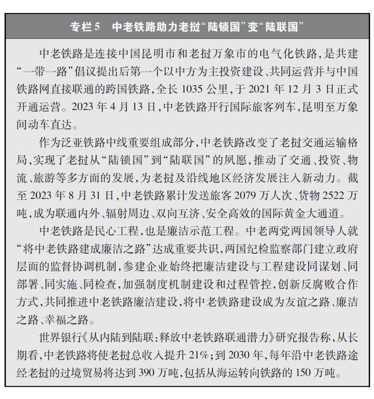 經濟走廊和國際通道建設卓有成效。共建國家共同推進國際骨干通道建設,打造連接亞洲各次區(qū)域以及亞歐非之間的基礎設施網絡。中巴經濟走廊方向,重點項目穩(wěn)步推進,白沙瓦-卡拉奇高速公路(蘇庫爾至木爾坦段)、喀喇昆侖公路二期(赫韋利揚-塔科特段)、拉合爾軌道交通橙線項目竣工通車,薩希瓦爾、卡西姆港、塔爾、胡布等電站保持安全穩(wěn)定運營,默拉直流輸電項目投入商業(yè)運營,卡洛特水電站并網發(fā)電,拉沙卡伊特別經濟區(qū)進入全面建設階段。新亞歐大陸橋經濟走廊方向,匈塞鐵路塞爾維亞貝爾格萊德-諾維薩德段于2022年3月開通運營,匈牙利布達佩斯-克萊比奧段啟動軌道鋪設工作;克羅地亞佩列沙茨跨海大橋迎來通車一周年;雙西公路全線貫通;黑山南北高速公路順利建成并投入運營。中國-中南半島經濟走廊方向,中老鐵路全線建成通車且運營成效良好,黃金運輸通道作用日益彰顯;作為中印尼共建“一帶一路”的旗艦項目,時速350公里的雅萬高鐵開通運行;中泰鐵路一期(曼谷-呵叻)簽署線上工程合同,土建工程已開工11個標段(其中1個標段已完工)。中蒙俄經濟走廊方向,中俄黑河公路橋、同江鐵路橋通車運營,中俄東線天然氣管道正式通氣,中蒙俄中線鐵路升級改造和發(fā)展可行性研究正式啟動。中國-中亞-西亞經濟走廊方向,中吉烏公路運輸線路實現常態(tài)化運行,中國-中亞天然氣管道運行穩(wěn)定,哈薩克斯坦北哈州糧油專線與中歐班列并網運行。孟中印緬經濟走廊方向,中緬原油和天然氣管道建成投產,中緬鐵路木姐-曼德勒鐵路完成可行性研究,曼德勒-皎漂鐵路啟動可行性研究,中孟友誼大橋、多哈扎里至科克斯巴扎爾鐵路等項目建設取得積極進展。在非洲,蒙內鐵路、亞吉鐵路等先后通車運營,成為拉動東非乃至整個非洲國家縱深發(fā)展的重要通道。