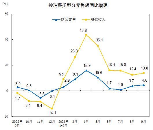 按消費(fèi)類型分,9月份,商品零售35539億元,同比增長(zhǎng)4.6%;餐飲收入4287億元,增長(zhǎng)13.8%。1—9月份,商品零售305002億元,同比增長(zhǎng)5.5%;餐飲收入37105億元,增長(zhǎng)18.7%。