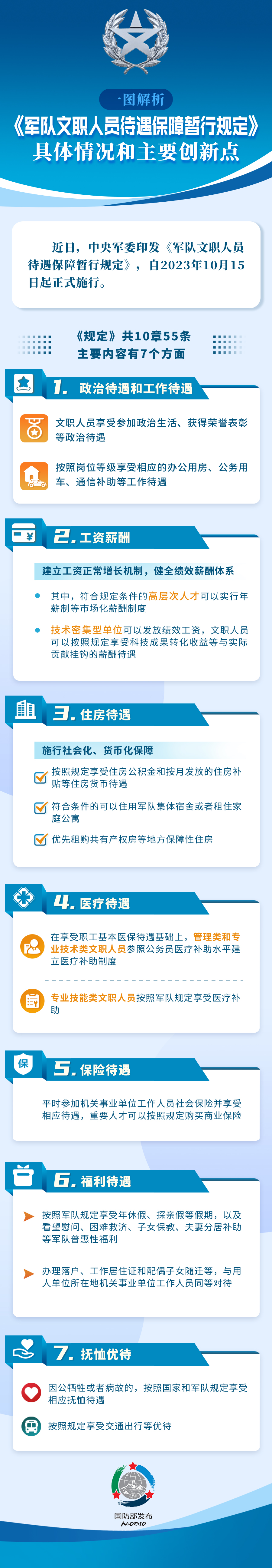 吳謙表示,近日,中央軍委印發(fā)《軍隊(duì)文職人員待遇保障暫行規(guī)定》,自2023年10月15日起正式施行?!兑?guī)定》的出臺(tái),將進(jìn)一步提高軍隊(duì)文職人員待遇保障,對(duì)于延攬社會(huì)優(yōu)秀人才獻(xiàn)身強(qiáng)軍事業(yè)、激發(fā)文職人員活力動(dòng)力、促進(jìn)文職人員隊(duì)伍高質(zhì)量發(fā)展,將發(fā)揮重要作用。