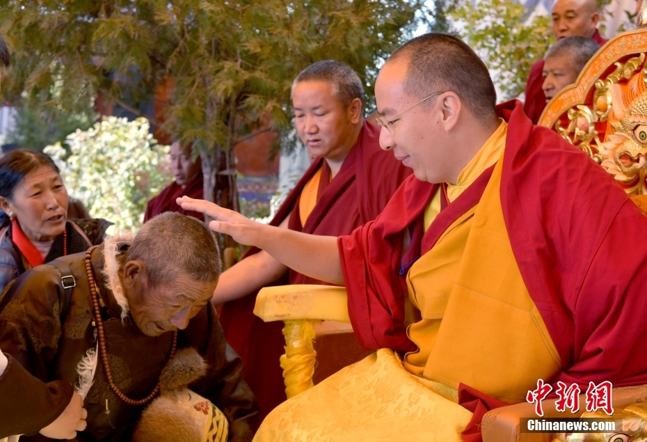 11月13日、14日,全國政協(xié)常委、中國佛教協(xié)會副會長、中國佛教協(xié)會西藏分會會長班禪額爾德尼·確吉杰布在日喀則扎什倫布寺為數(shù)萬名信教群眾摸頂賜福。圖為11月13日,班禪為信眾摸頂賜福。