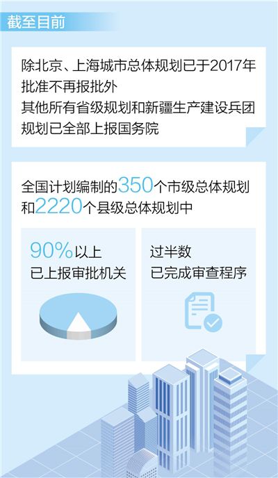 自然資源部國土空間規(guī)劃局局長(zhǎng)張兵介紹,截至目前,除北京、上海城市總體規(guī)劃已于2017年批準(zhǔn)不再報(bào)批外,其他所有省級(jí)規(guī)劃和新疆生產(chǎn)建設(shè)兵團(tuán)規(guī)劃已全部上報(bào)國務(wù)院,其中江蘇、廣東、寧夏等省級(jí)規(guī)劃已經(jīng)批復(fù)。全國計(jì)劃編制的350個(gè)市級(jí)總體規(guī)劃和2220個(gè)縣級(jí)總體規(guī)劃中,90%以上已上報(bào)審批機(jī)關(guān),過半數(shù)已完成審查程序,江蘇、廣東的部分市級(jí)總體規(guī)劃已由省級(jí)人民政府批準(zhǔn)實(shí)施。