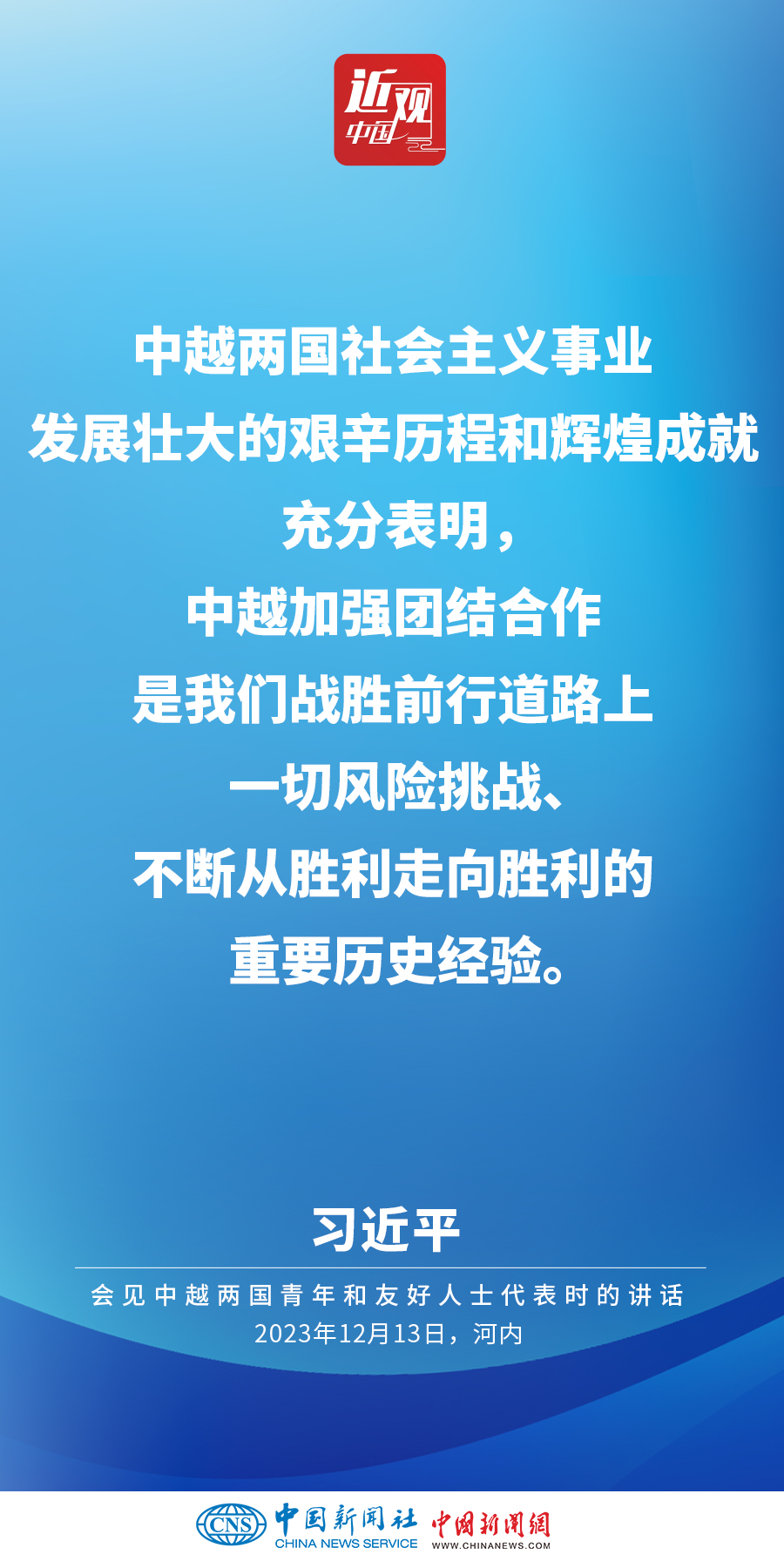 當(dāng)?shù)貢r(shí)間12月13日下午,中共中央總書記、國(guó)家主席習(xí)近平和夫人彭麗媛在河內(nèi)同越共中央總書記阮富仲夫婦共同會(huì)見(jiàn)中越兩國(guó)青年和友好人士代表。他在題為《賡續(xù)傳統(tǒng)友誼,開創(chuàng)中越命運(yùn)共同體建設(shè)新征程》的重要講話中指出,展望未來(lái),我們要始終不忘初心,牢記使命,攜手走好各自社會(huì)主義道路,讓工業(yè)化現(xiàn)代化建設(shè)成果更多惠及兩國(guó)人民,共同為人類進(jìn)步事業(yè)作出更大貢獻(xiàn)。