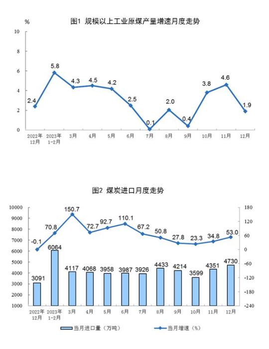 原煤生產(chǎn)穩(wěn)定增長(zhǎng),進(jìn)口高速增長(zhǎng)。12月份,規(guī)上工業(yè)原煤產(chǎn)量4.1億噸,同比增長(zhǎng)1.9%,增速比11月份放緩2.7個(gè)百分點(diǎn),日均產(chǎn)量1336萬(wàn)噸。進(jìn)口煤炭4730萬(wàn)噸,同比增長(zhǎng)53.0%,增速比11月份加快18.2個(gè)百分點(diǎn)。