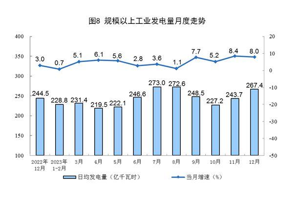 電力生產(chǎn)平穩(wěn)。12月份,規(guī)上工業(yè)發(fā)電量8290億千瓦時(shí),同比增長(zhǎng)8.0%,增速比11月份放緩0.4個(gè)百分點(diǎn),日均發(fā)電267.4億千瓦時(shí)。2023年,規(guī)上工業(yè)發(fā)電量8.9萬(wàn)億千瓦時(shí),同比增長(zhǎng)5.2%。