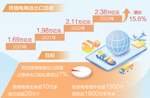 據(jù)海關(guān)測算,2023年,我國跨境電商進(jìn)出口總額2.38萬億元,增長15.6%。其中,出口1.83萬億元,增長19.6%;進(jìn)口5483億元,增長3.9%??缇畴娚炭焖侔l(fā)展,既滿足了國內(nèi)消費(fèi)者多樣化個性化需求,又助力我國產(chǎn)品通達(dá)全球,成為外貿(mào)發(fā)展的重要動能。