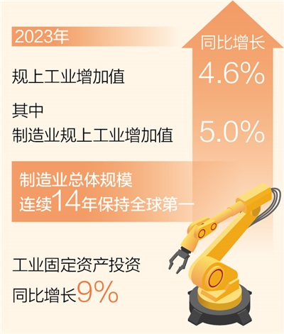 本報北京1月21日電 (記者王政、劉溫馨)記者日前從工業(yè)和信息化部獲悉:2023年,全年規(guī)模以上工業(yè)增加值同比增長4.6%,較2022年提升1個百分點,其中制造業(yè)規(guī)模以上工業(yè)增加值同比增長5.0%,我國制造業(yè)總體規(guī)模連續(xù)14年保持全球第一。