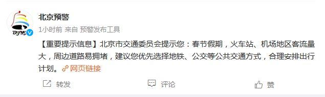 北京市交通委:春節(jié)假期火車站周邊易擁堵,建議優(yōu)先選擇公共交通