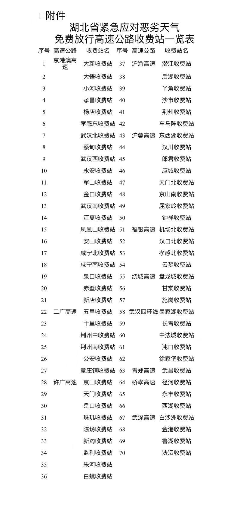 中新網(wǎng)2月6日電 記者6日從交通運(yùn)輸部獲悉,針對(duì)近日湖北省境內(nèi)部分高速公路路段因惡劣天氣造成車(chē)輛擁堵嚴(yán)重的情況,結(jié)合最新天氣預(yù)報(bào)及路網(wǎng)運(yùn)行情況,經(jīng)湖北省人民政府和交通運(yùn)輸部同意,調(diào)整免費(fèi)放行收費(fèi)站所及時(shí)間區(qū)間,自2024年2月5日20:00至6日12:00,對(duì)在指定收費(fèi)站駛出高速公路的所有車(chē)輛實(shí)施免費(fèi)放行。具體70座收費(fèi)站如下↓(中新財(cái)經(jīng))