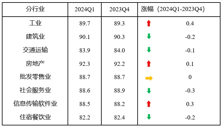 分行業(yè)指數(shù)3升1平4降。一季度,工業(yè)、房地產(chǎn)業(yè)和信息傳輸計算機服務(wù)軟件業(yè)指數(shù)比上季度分別上升0.4、0.1和0.3點,批發(fā)零售業(yè)指數(shù)持平,建筑業(yè)、交通運輸郵政倉儲業(yè)、社會服務(wù)業(yè)和住宿餐飲業(yè)指數(shù)比上季度分別下降0.2、0.1、0.3和0.2點,社會服務(wù)業(yè)指數(shù)降幅較大。8個分行業(yè)指數(shù)均處于景氣臨界值100以下。