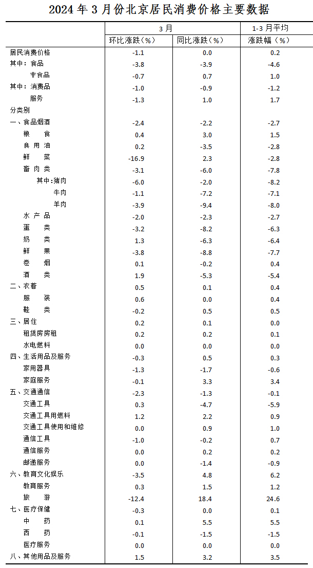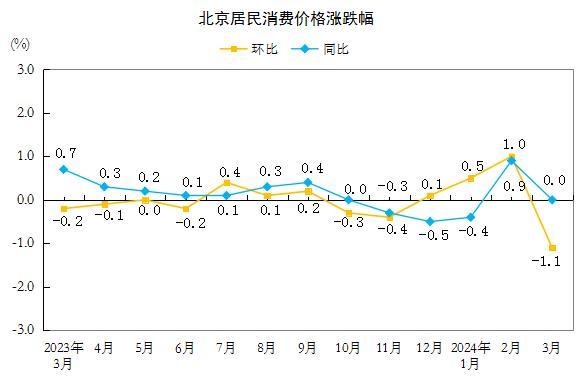 北京3月居民消費(fèi)價格環(huán)比下降1.1% 同比持平