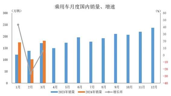 2024年3月,乘用車產(chǎn)銷分別完成225萬輛和223.6萬輛,環(huán)比分別增長76.7%和67.8%,同比分別增長4.7%和10.9%。