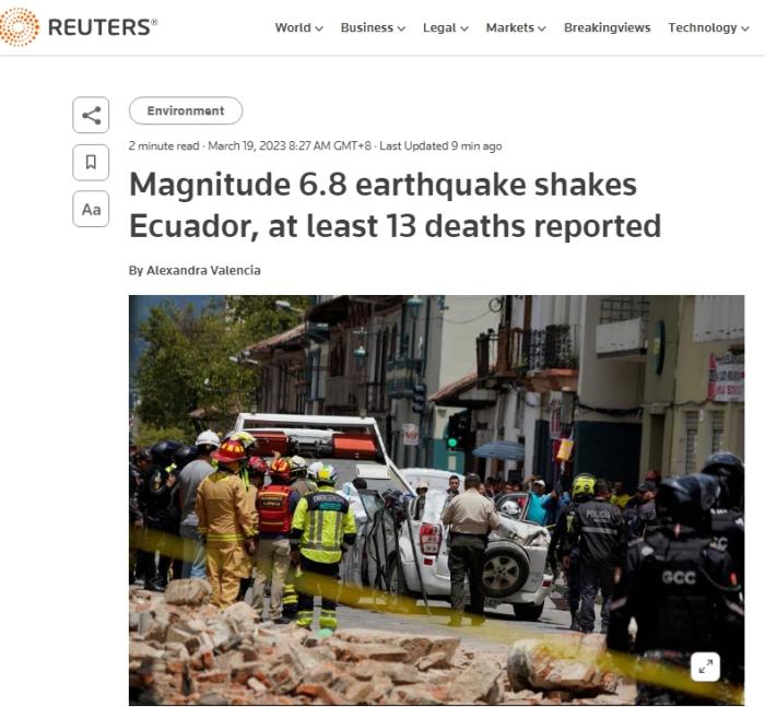 中新網(wǎng)3月19日 綜合外媒報道,當?shù)貢r間18日約12時,厄瓜多爾發(fā)生6.8級地震,造成至少14人遇難,超過380人受傷,多處房屋、學校和醫(yī)療中心遭到結構性破壞。