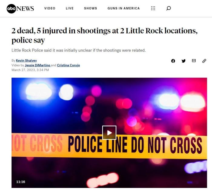 中新網3月27日電 據美國廣播公司(ABC)報道,當地時間26日晚,阿肯色州小石城發(fā)生兩起槍擊事件,造成2人死亡,5人受傷。據美國“槍支暴力檔案”網站27日發(fā)布的最新數據顯示,截至目前,美國2023年因槍死亡人數已接近10000人。