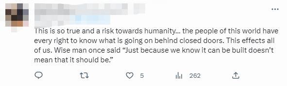 在網(wǎng)絡(luò)上,這封信也引起熱烈討論,有網(wǎng)友表示認(rèn)同,人們需要知道發(fā)生了什么,“僅僅因?yàn)槲覀冎揽梢越ㄔ焖⒉灰馕吨鴳?yīng)該建造”。