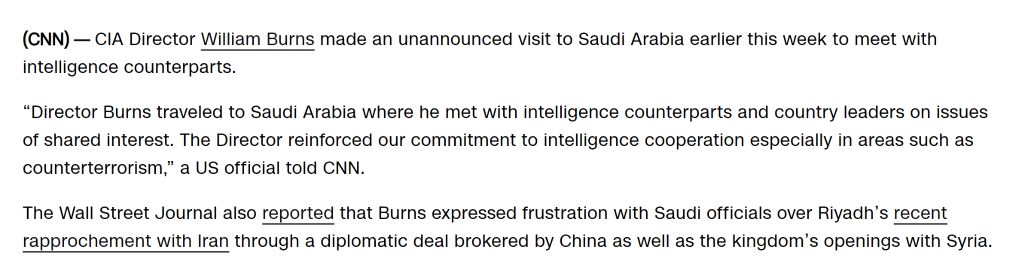 據(jù)美國有線電視新聞網(wǎng)報道,伯恩斯與沙特高級官員討論了“共同利益”,包括情報合作和反恐等問題?!度A爾街日報》文章稱,伯恩斯對沙特接受中國斡旋與伊朗復(fù)交、沙特與敘利亞走近等表示“失望”“錯愕”,重申伊朗和敘利亞仍處于美國的制裁中。
