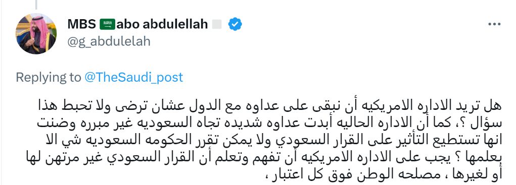 沙特網(wǎng)友阿博·阿卜杜勒拉言辭激烈地批評:“只有我們與其他國家保持?jǐn)骋饷绹挪粫麊??美國政府對沙特表現(xiàn)出強(qiáng)烈而無理的敵意,居然還認(rèn)為它可以影響沙特的決定、沙特只能在它的指導(dǎo)下做事?美國政府必須了解,沙特的決定不依附于任何其他人。祖國的利益高于一切。
