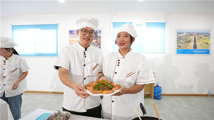 4月6日,柬埔寨新金邊國(guó)際機(jī)場(chǎng)項(xiàng)目建設(shè)現(xiàn)場(chǎng),劉曉仙(左)和曼玉良在中國(guó)建筑(柬埔寨)職工廚王爭(zhēng)霸賽上展示“中建(柬)一家親”炒米粉。中國(guó)建筑供圖