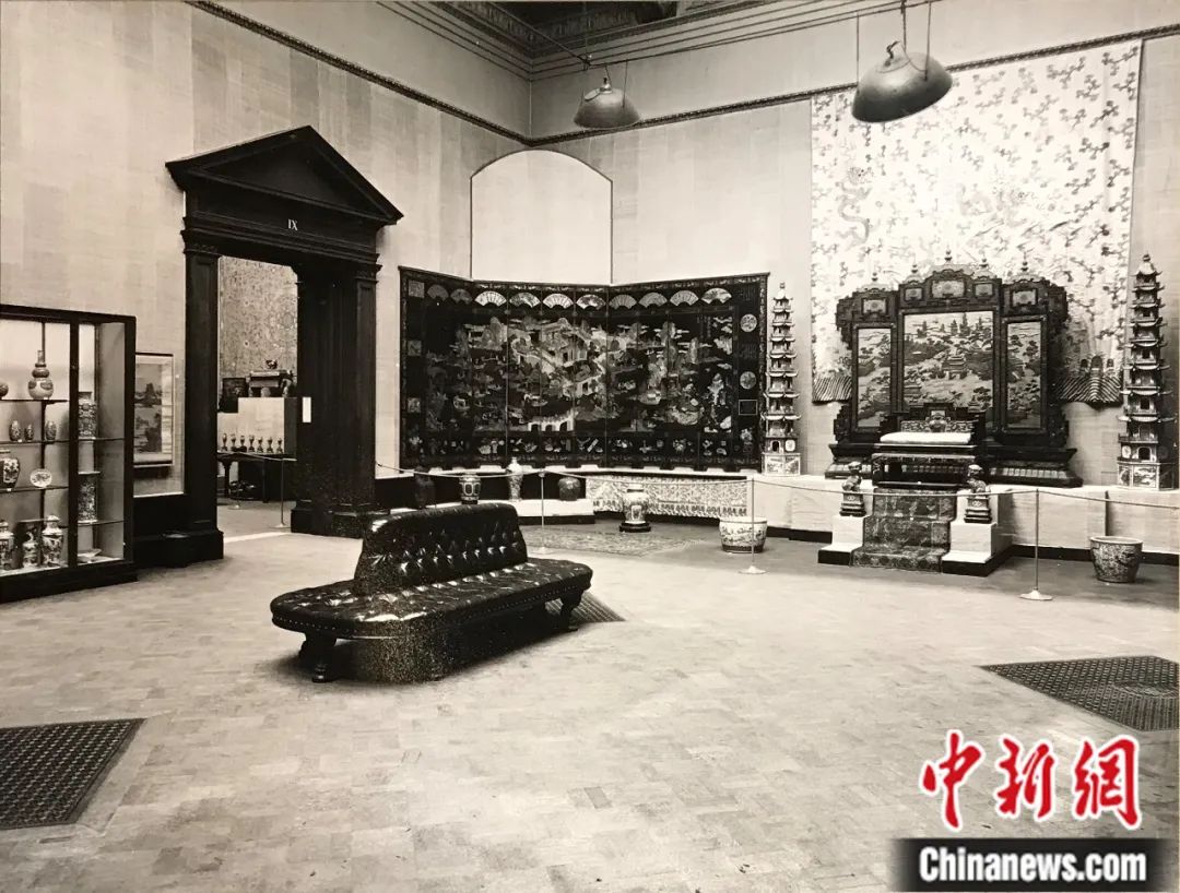 倫敦中國藝術國際展覽會上展出的皇帝寶座與屏風。圖片來源:The Royal Academy of Arts