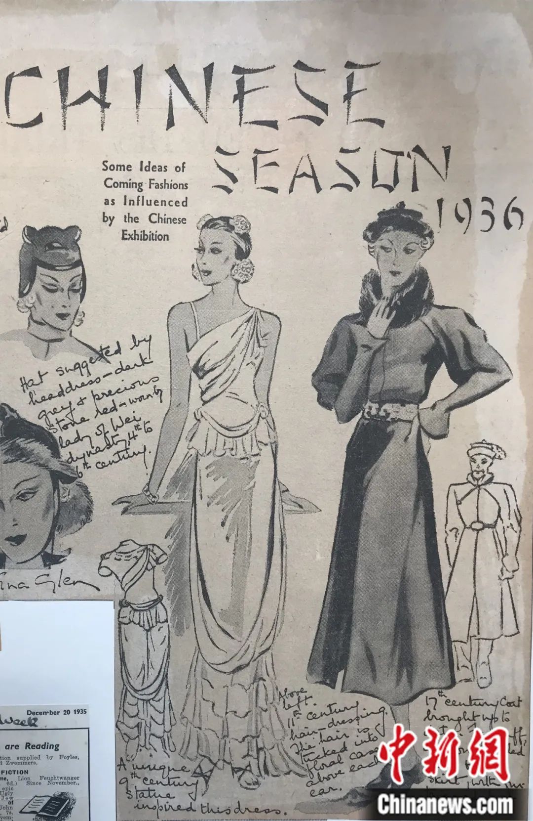展覽開幕前,Vogue雜志于1935年10月30日用一整版的篇幅,梳理預測了中國佛像的衣紋裝飾以及陶瓷的花紋色彩,即將對時尚帶來的一些影響。倫敦藝展開幕后,歐洲時尚設計師陸續(xù)趕赴伯靈頓宮參觀展覽,希望從中找尋時尚設計的靈感。一條春季時尚長裙的設計靈感,來源于展覽中的一座唐代漢白玉菩薩立姿像。佛像婀娜娉婷的身姿、華美精致的瓔珞以及輕薄柔軟的長裙,深深吸引著設計師的目光。