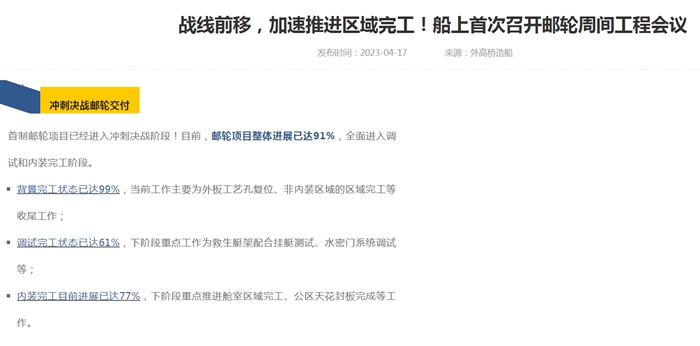 中新網(wǎng)4月18日電(中新財(cái)經(jīng)記者 吳濤)“首制郵輪項(xiàng)目已經(jīng)進(jìn)入沖刺決戰(zhàn)階段!目前,郵輪項(xiàng)目整體進(jìn)展已達(dá)91%,全面進(jìn)入調(diào)試和內(nèi)裝完工階段。”近日,首艘國(guó)產(chǎn)大郵輪最新進(jìn)展公布。