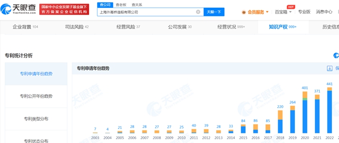 天眼查顯示,近三年,外高橋造船專利申請(qǐng)數(shù)量猛增,2020年為401件,2021年371件,2022年達(dá)到441件。這其中有不少專利涉及到大型郵輪,例如“大型郵輪反彈式水封地漏”“大型郵輪醫(yī)院抽風(fēng)管過(guò)濾裝置”等。