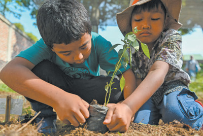 在印度尼西亞班達(dá)亞齊的一所自然小學(xué)里,學(xué)生們正在種植樹苗。