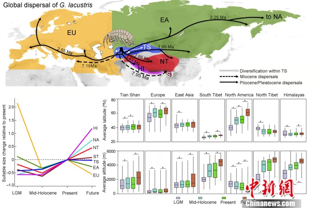 此次野外調查研究發(fā)現(xiàn),高山湖泊是冷水性鉤蝦全球遷移擴展的通道,更新世氣候變冷形成大量高山湖泊或冰川湖,驅動鉤蝦多次從天山拓殖到全球高山湖泊以及環(huán)北寒帶冰川湖泊中,該研究定義這種新的分化方式為“出芽式分化”。研究還發(fā)現(xiàn),未來氣候變暖將導致鉤蝦局限在更高海拔更高緯度,造成遺傳多樣性降低。