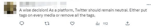 對(duì)推特的最新變化,有網(wǎng)友表示歡迎?!耙粋€(gè)明智的決定!作為一個(gè)平臺(tái),推特應(yīng)該保持中立。要么給每個(gè)媒體上都打標(biāo)簽,要么刪除所有標(biāo)簽。”