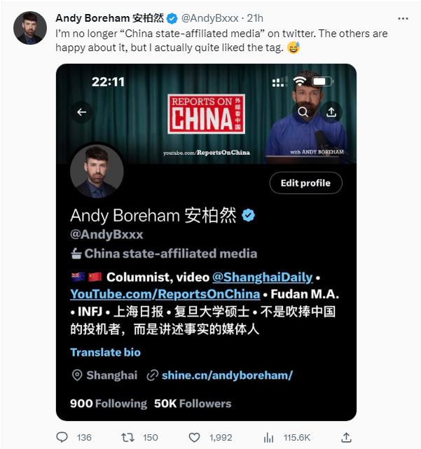 在上海工作生活了近10年的新西蘭媒體人安柏然寫道,“我不再是推特上的‘中國(guó)官方媒體’了。其他人對(duì)此很高興,但我其實(shí)很喜歡這個(gè)標(biāo)簽?!?/p>