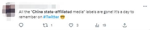 有網(wǎng)友稱,“所有‘中國(guó)官方媒體’的標(biāo)簽都消失了!這是推特上值得紀(jì)念的一天?!?/p>