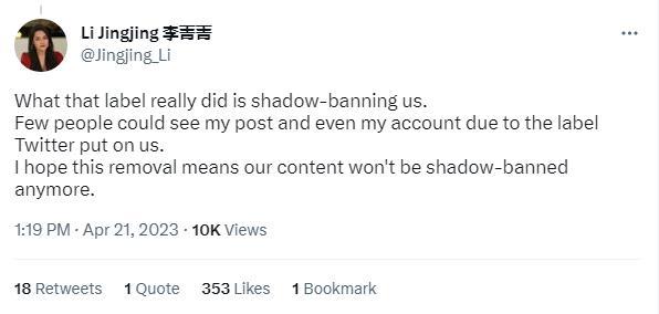 中國(guó)英文主持人李菁菁指出,推特的“官媒”標(biāo)簽實(shí)際是一種“影子禁令”,為暗中設(shè)限提供方便?!坝捎谕铺亟o我們貼上了標(biāo)簽,很少有人能看到我的帖子,甚至很難找到我的賬號(hào)。我希望這次刪除(標(biāo)簽)意味著我們發(fā)布的內(nèi)容不會(huì)再被暗中禁止?!?/p>