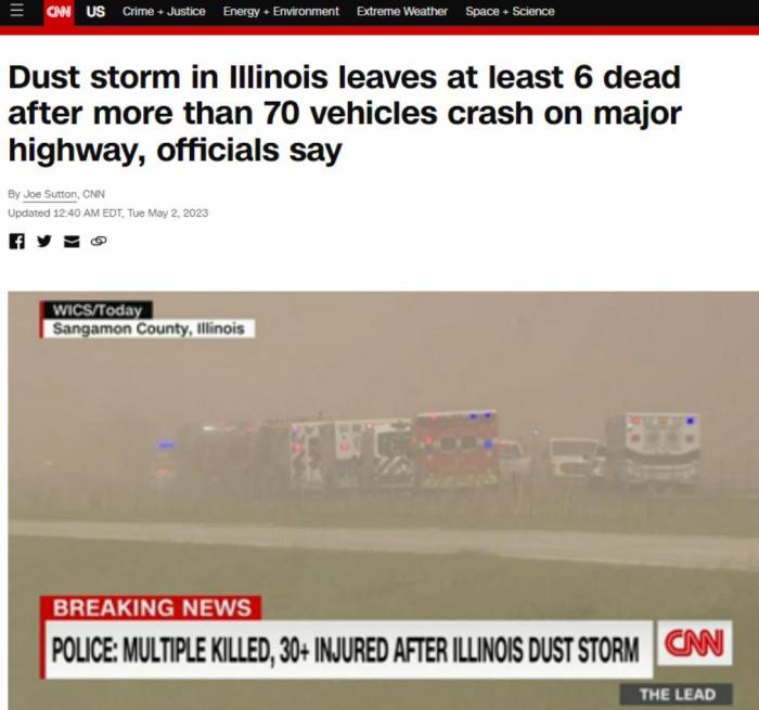 中新網(wǎng)5月2日電 綜合美媒消息,當(dāng)?shù)貢r間5月1日,由于沙塵暴導(dǎo)致能見度降低,70余輛汽車在美國伊利諾伊州55號州際公路蒙哥馬利縣法默斯維爾鎮(zhèn)附近路段相撞,事故已造成至少6人死亡,37人受傷入院。