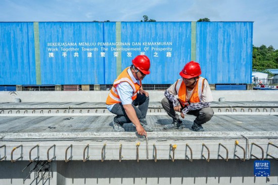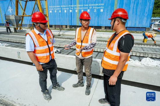 4月26日,在馬來西亞吉蘭丹州的馬東鐵項目一分部制梁場,技術(shù)主管鄧友志(右)和馬來西亞本地青年員工鄧德緯討論生產(chǎn)情況。五月初的馬來西亞烈日炎炎,中馬共建“一帶一路”的標志性項目——馬來西亞東海岸鐵路(馬東鐵)建設(shè)如火如荼。十支由中馬兩國員工組成的青年突擊隊活躍在全長600多公里的馬東鐵沿線建設(shè)現(xiàn)場,用汗水和擔當抒寫屬于這個時代的青春篇章。新華社記者 朱煒 攝