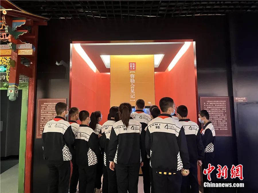 運(yùn)用現(xiàn)代科技手段展示的彌勒會(huì)見(jiàn)記受到學(xué)生的關(guān)注和喜愛(ài)。新疆哈密市博物館 供圖