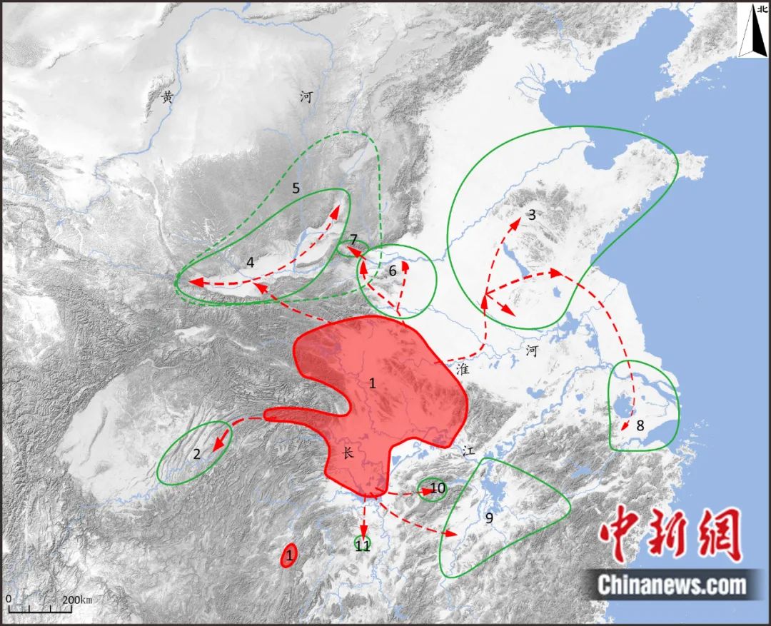 屈家?guī)X文化對外擴張路線示意圖(紅色區(qū)域為屈家?guī)X文化主要分布范圍)。受訪者 供圖
