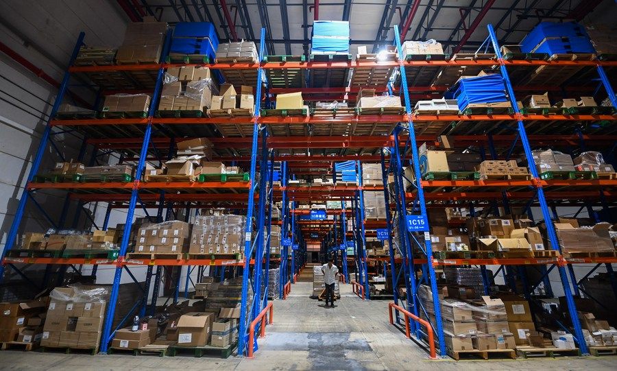 2022年9月2日,在杭州綜合保稅區(qū)一家跨境保稅倉內,工作人員在搬運跨境電商保稅進口商品。新華社記者 徐昱 攝