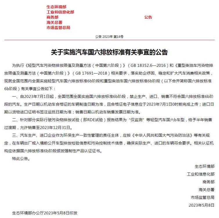 其中要求,自2023年7月1日起,全國(guó)范圍全面實(shí)施國(guó)六排放標(biāo)準(zhǔn)6b階段,禁止生產(chǎn)、進(jìn)口、銷售不符合國(guó)六排放標(biāo)準(zhǔn)6b階段的汽車。生產(chǎn)日期以機(jī)動(dòng)車合格證的車輛制造日期為準(zhǔn),且合格證電子信息應(yīng)于2023年7月1日0時(shí)前完成上傳;進(jìn)口日期以貨物進(jìn)口證明書(shū)簽注運(yùn)抵日期為準(zhǔn);銷售日期以機(jī)動(dòng)車銷售發(fā)票日期為準(zhǔn)。