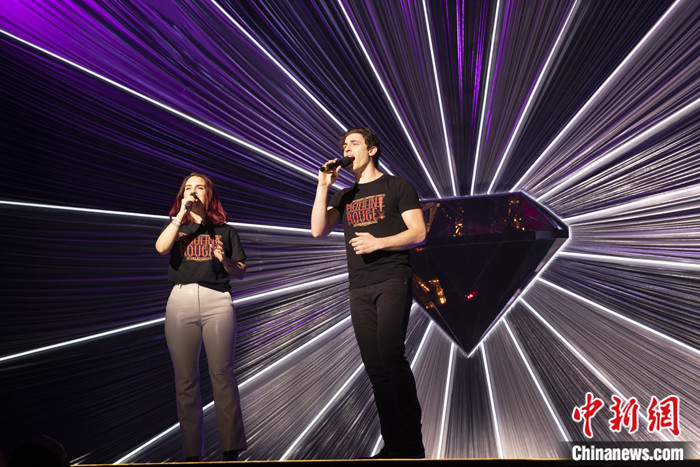 圖為該劇主演德里克·克雷納(Derek Klena)和喬安娜·勒文斯克(Joanna“Jojo” Levesque)為學(xué)生們獻唱。 中新社記者 廖攀 攝