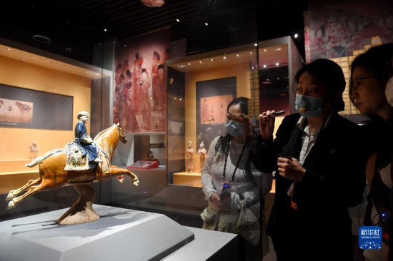 5月8日,游客在西安博物院參觀唐代三彩騰空馬。飛騰的三彩馬上騎有一胡俑,真實(shí)再現(xiàn)了絲綢之路上西域胡人急奔長安的生動形象。