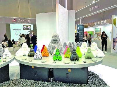 在中東歐展區(qū)的文化市集上,中國與中東歐國家的當代藝術(shù)品同臺展出。其中,最吸引參觀者目光的,當屬展臺正中擺放的一系列形態(tài)各異的中國藝術(shù)家原創(chuàng)IP形象“大衛(wèi)猿”雕塑或毛絨玩具。創(chuàng)作者袁澤銘介紹,本次展出的“大衛(wèi)猩球”項目邀請包括中國以及波黑、匈牙利、羅馬尼亞等中東歐國家在內(nèi)的全球藝術(shù)家為“大衛(wèi)猿”添加各自獨特的涂裝,體現(xiàn)了不同國家藝術(shù)家之間的文化交流以及藝術(shù)可能性的碰撞。