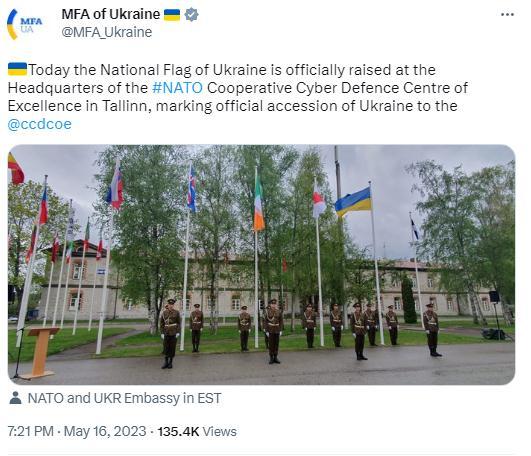 烏克蘭外交部在推特上發(fā)布圖片并配文稱,“今天,烏克蘭國(guó)旗在位于塔林的北約合作網(wǎng)絡(luò)防御卓越中心總部正式升起,標(biāo)志著烏克蘭正式加入該組織?!?/p>