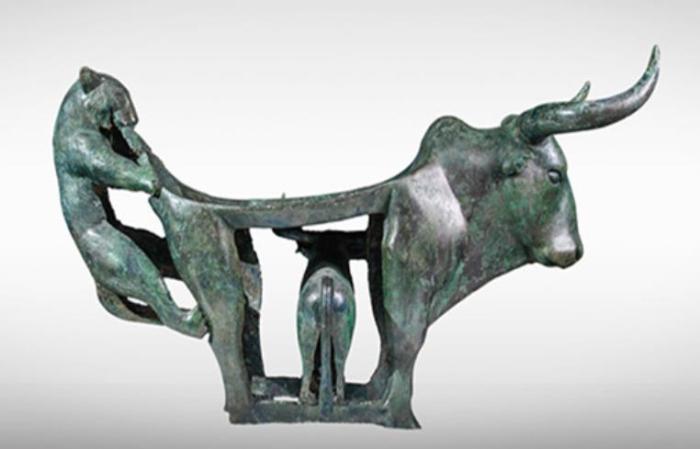 作為古滇國的一件祭器,牛虎銅案特殊的組合造型使整個(gè)銅案重心平穩(wěn),大小和諧,動(dòng)靜均衡統(tǒng)一,在力學(xué)和美學(xué)上都達(dá)到了極高水平,是云南青銅文化藝術(shù)的杰作。