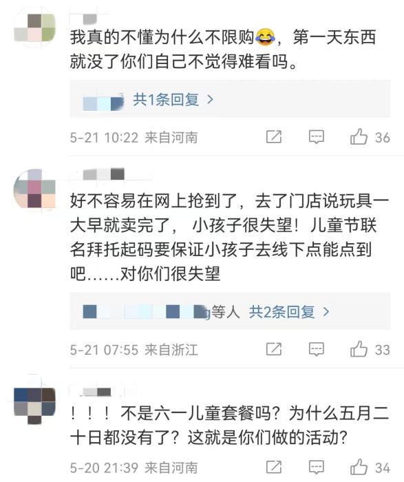 但自5月20日起,在社交平臺(tái)上,就不斷有人反映,已經(jīng)買(mǎi)不到肯德基兒童節(jié)限定玩具。肯德基的官方微博下,也有很多人留言,門(mén)店已售罄,能不能補(bǔ)貨。