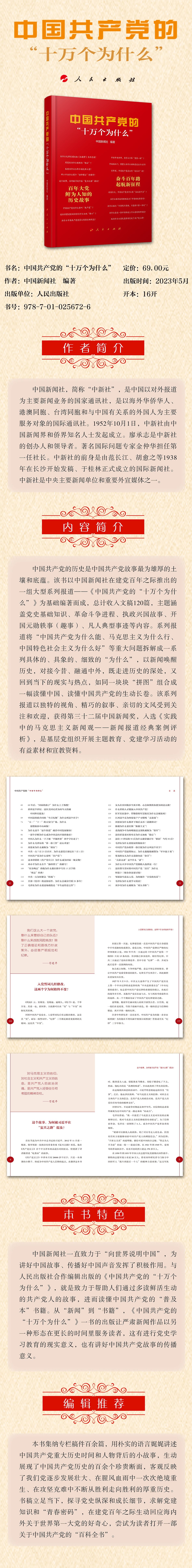 中國(guó)共產(chǎn)黨的歷史是中國(guó)共產(chǎn)黨故事最為雄厚的土壤和底蘊(yùn)。該書以中國(guó)新聞社在建黨百年之際推出的一組大型系列報(bào)道——《中國(guó)共產(chǎn)黨的“十萬(wàn)個(gè)為什么”》為基礎(chǔ)編著而成,總計(jì)收入文稿120篇,主題涵蓋黨史基礎(chǔ)知識(shí)、革命斗爭(zhēng)進(jìn)程、執(zhí)政興國(guó)故事、開(kāi)國(guó)元?jiǎng)纵W事(趣事)、凡人典型事跡等內(nèi)容。系列報(bào)道將“中國(guó)共產(chǎn)黨為什么能、馬克思主義為什么行、中國(guó)特色社會(huì)主義為什么好”等重大問(wèn)題拆解成一系列具體的、具象的、細(xì)致的“為什么”,以新聞喚醒歷史,對(duì)接今昔、融通中外,既走進(jìn)歷史的深處,又回到當(dāng)下的現(xiàn)實(shí)與熱點(diǎn),如同一塊塊“拼圖”組合成一幅讀懂中國(guó)、讀懂中國(guó)共產(chǎn)黨的生動(dòng)長(zhǎng)卷。該系列報(bào)道以獨(dú)特的視角、精巧的敘事、親切的文風(fēng)受到關(guān)注和歡迎,獲得第三十二屆中國(guó)新聞獎(jiǎng),入選《實(shí)踐中的馬克思主義新聞?dòng)^——新聞報(bào)道經(jīng)典案例評(píng)析》,是基層黨組織開(kāi)展主題教育、黨建學(xué)習(xí)活動(dòng)的有益素材和宣教資料。