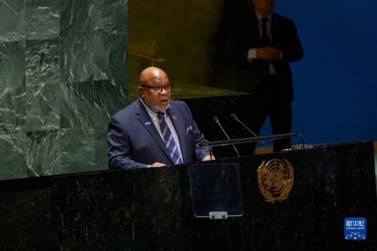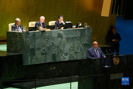 6月1日,在位于紐約的聯(lián)合國總部,特立尼達和多巴哥常駐聯(lián)合國代表丹尼斯·弗朗西斯(前)當選第78屆聯(lián)合國大會主席后發(fā)表講話。新華社發(fā)(聯(lián)合國供圖/洛伊·費利普攝)